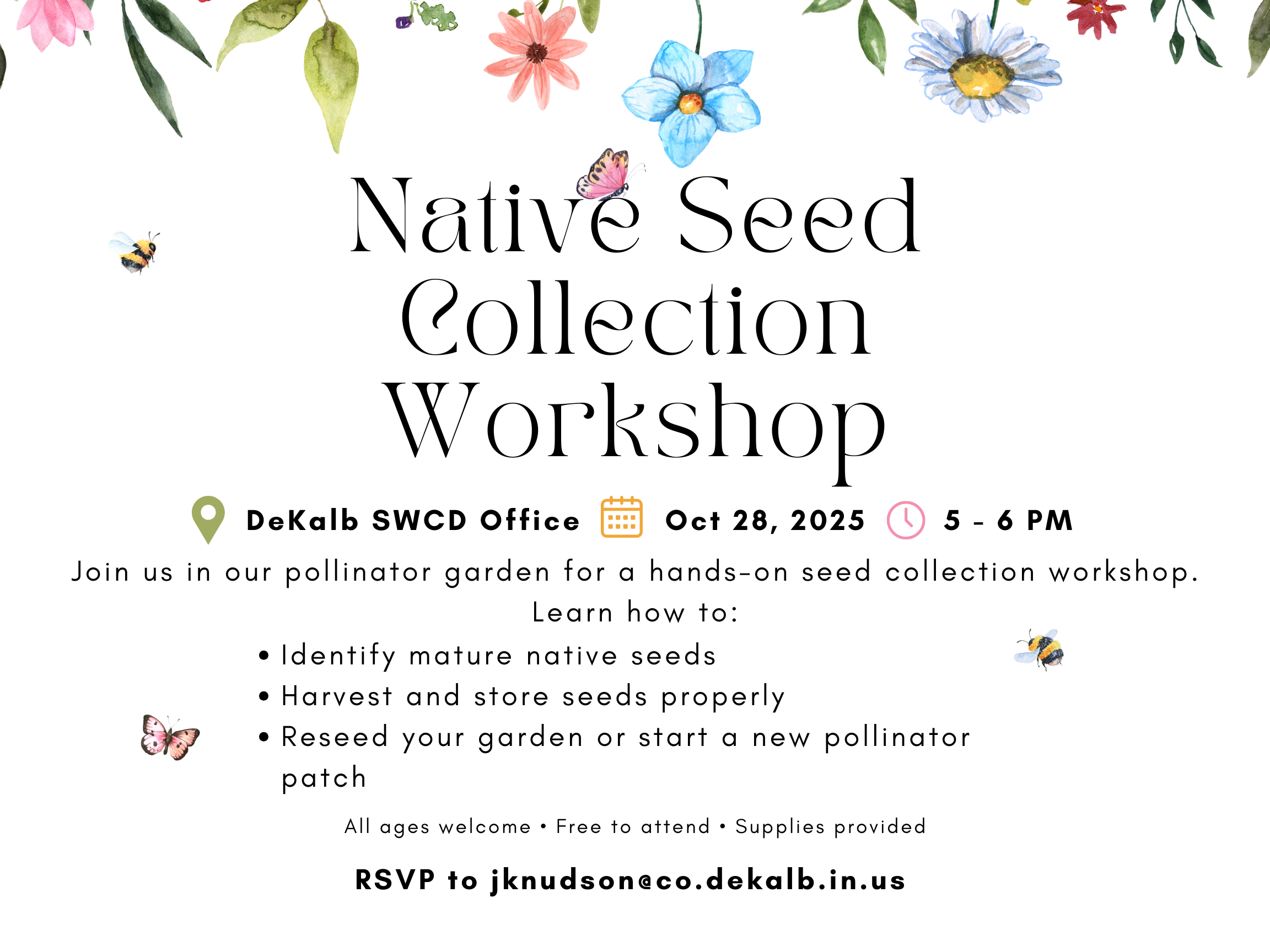 Native Seed Collection Workshop Tuesday, October 28, 2025 5:00 PM 6:00 PM DeKalb County Soil & Water Conservation District 942 West 15th Street Auburn, IN, 46706 United States (map) Google Calendar ICS