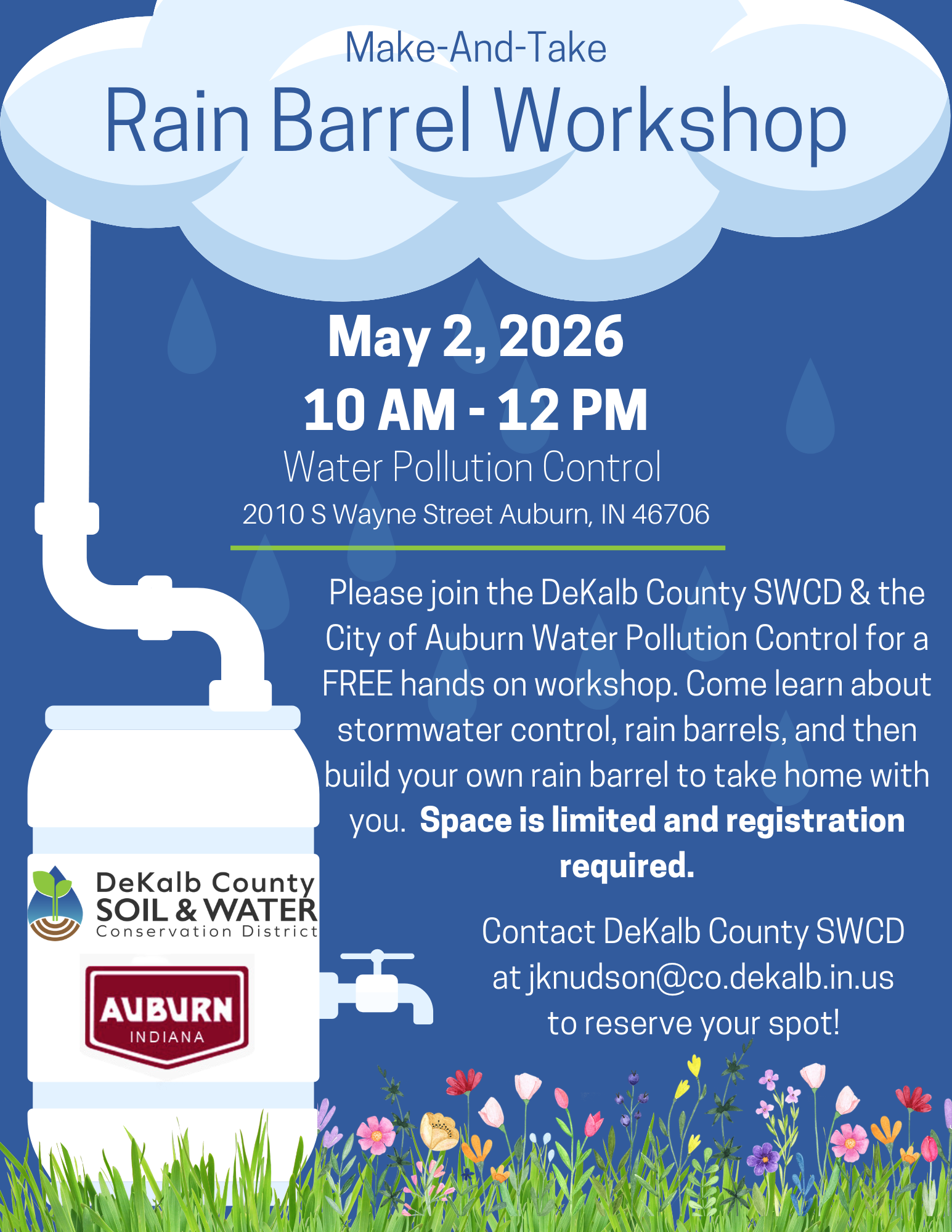Spring Rain Barrel Workshop Saturday, May 2, 2026 10:00 AM 12:00 PM Water Pollution Control Department 2010 Wayne Street Auburn, IN, 46706 United States (map) Google Calendar ICS